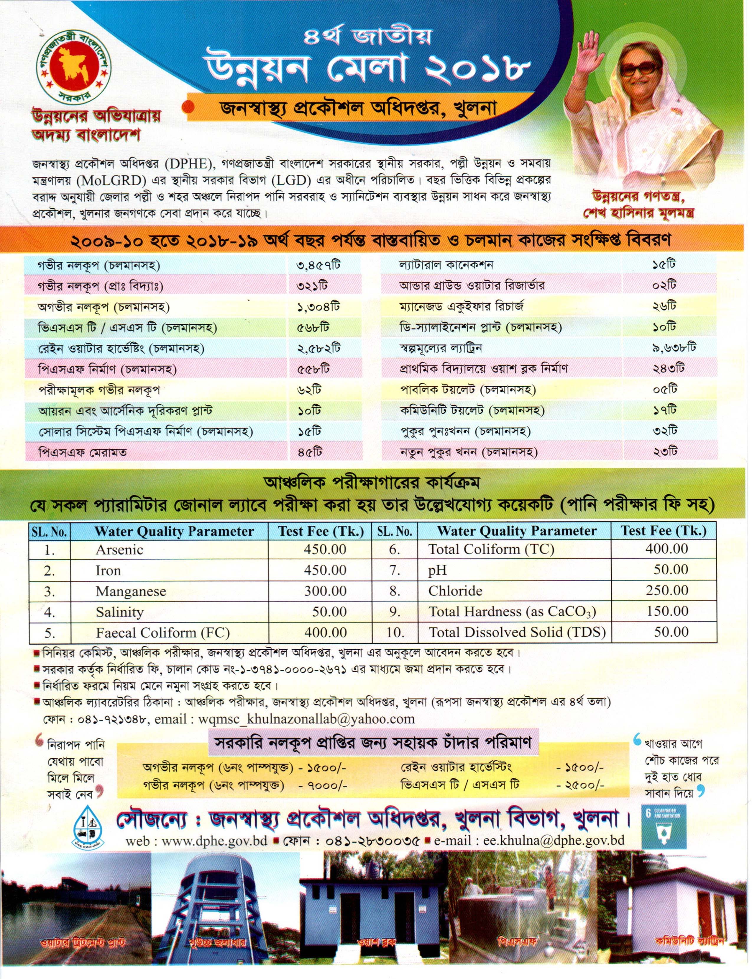 খুলনা জেলায় জানুয়ারি ২০১৮ পর্যন্ত মোট চালু নলকূপের সংখ্যা ২৭৭৪০ টি। এর মধ্যে গভীর নলকূপ ১৩১৮৮ টি, অগভীর ১১১২৮ টি, পি এস এফ ৮ টি, ভি এস এস টি ১৯৮ টি, এস এস টি ১৩৩৮ টি, রেইন ওয়াটার হারভেস্টিং ১৮৮০ টি। এছাড়া সরকারী প্রাথমিক বিদ্যালয়য়ে গভীর নলকূপ ৩২১ টি স্থাপন করা হয়েছে । সরকারী প্রাথমিক বিদ্যালয়য়ে উন্নত স্যানিটেশন এর জন্য ওয়াশ ব্লক ২২৭ টি স্থাপন করা হয়েছে। এছাড়া স্যানিটেশন বাবস্থা উন্নয়নের লক্ষ্যেঅদ্যবধি বিনামূল্যে ৯০০ টি ল্যাট্রিন সেট বিতরণ, স্বল্পমূল্যের ১০০০ টি ল্যাট্রিন স্থাপন, ১০ টি কমউনিটি ল্যাট্রিন ও ১ টি পাবলিক টয়লেট স্থাপন করা হয়েছে। এছাড়া জেলা অফিস ও প্রতিটি উপজেলায় বিনামূল্যে ফিল্ড কিটের মাধ্যমে পানি পরীক্ষা এবং হাইজিন শিক্ষা প্রদান করা হয়। আঞ্চলিক পানি পরিক্ষাগার ফি প্রদানের মাধ্যমে পানি পরীক্ষা হয়।এছাড়া প্রশাসনের সহযোগিতায় প্রতি বছর জনস্বাস্থ্য প্রকৌশল অধিদপ্তর জাতীয়ভাবে স্যানিটেশন মাস উদযাপন করে থাকে।